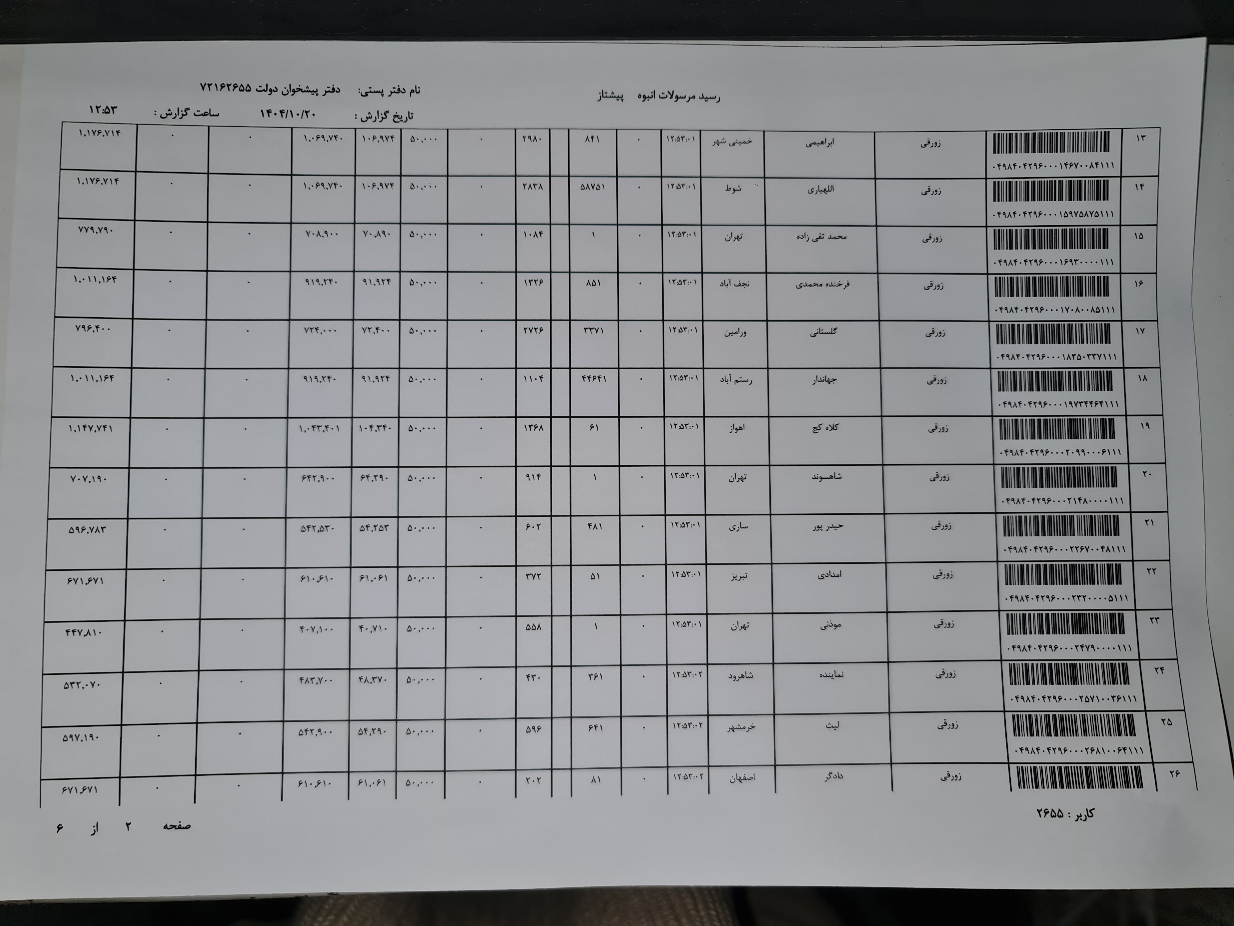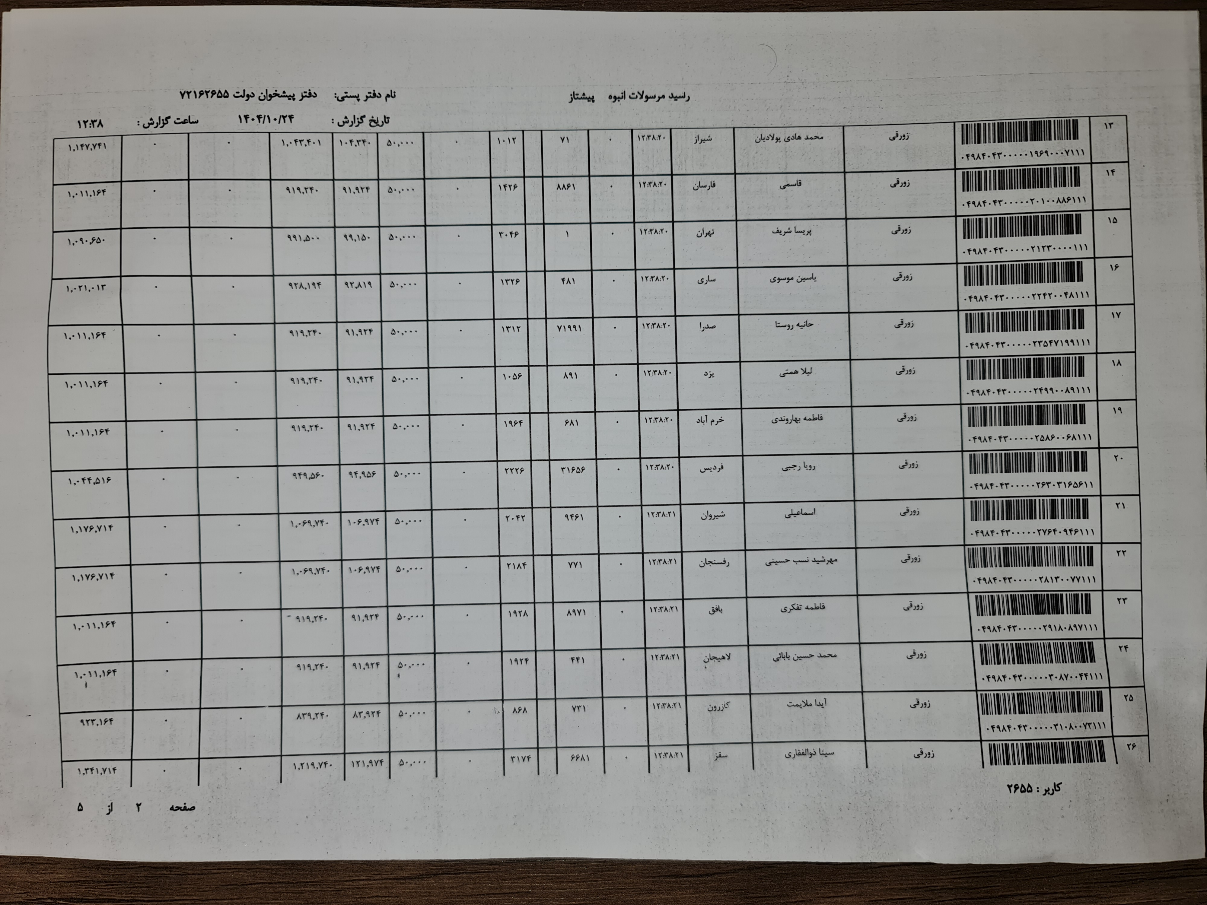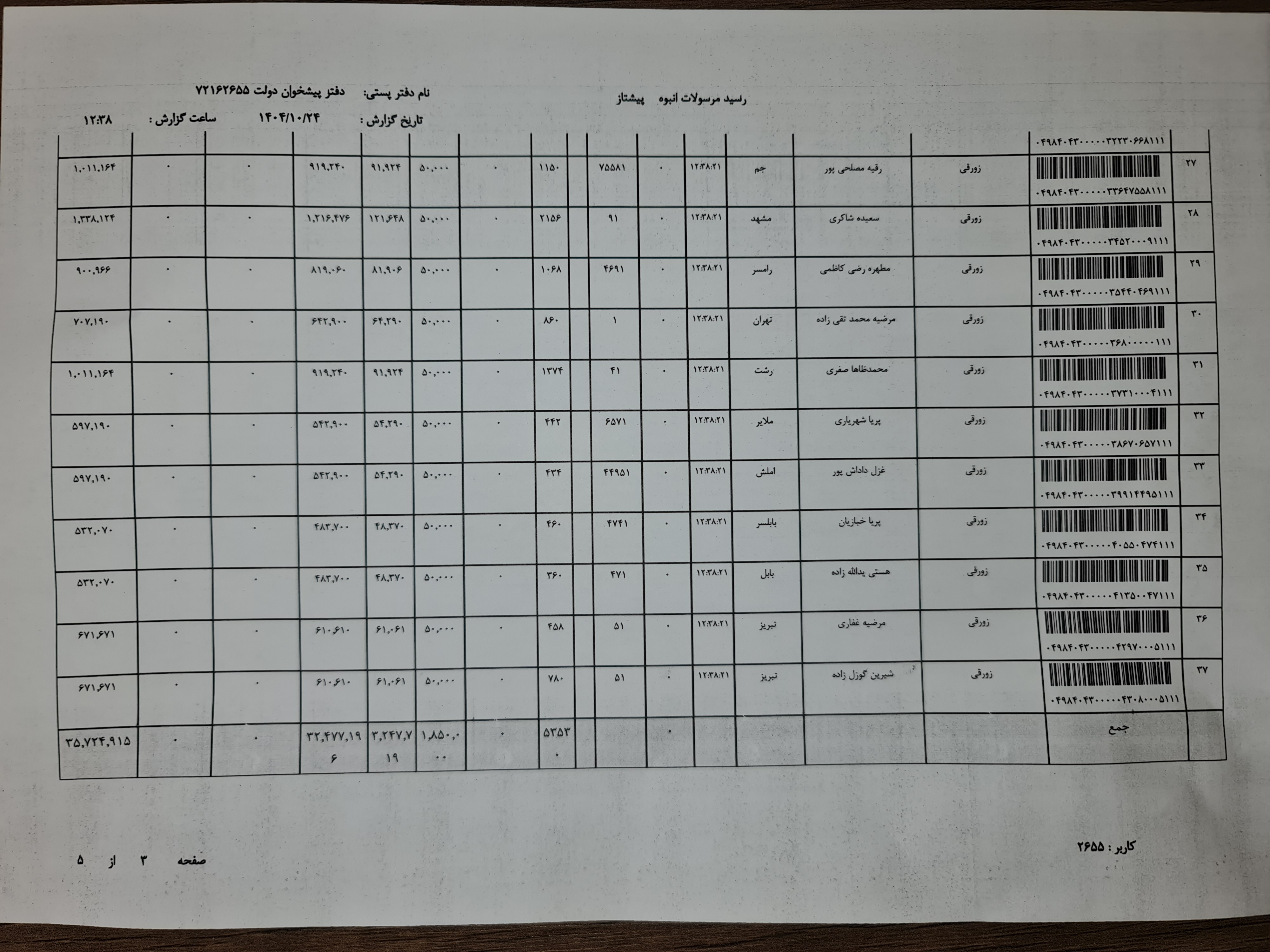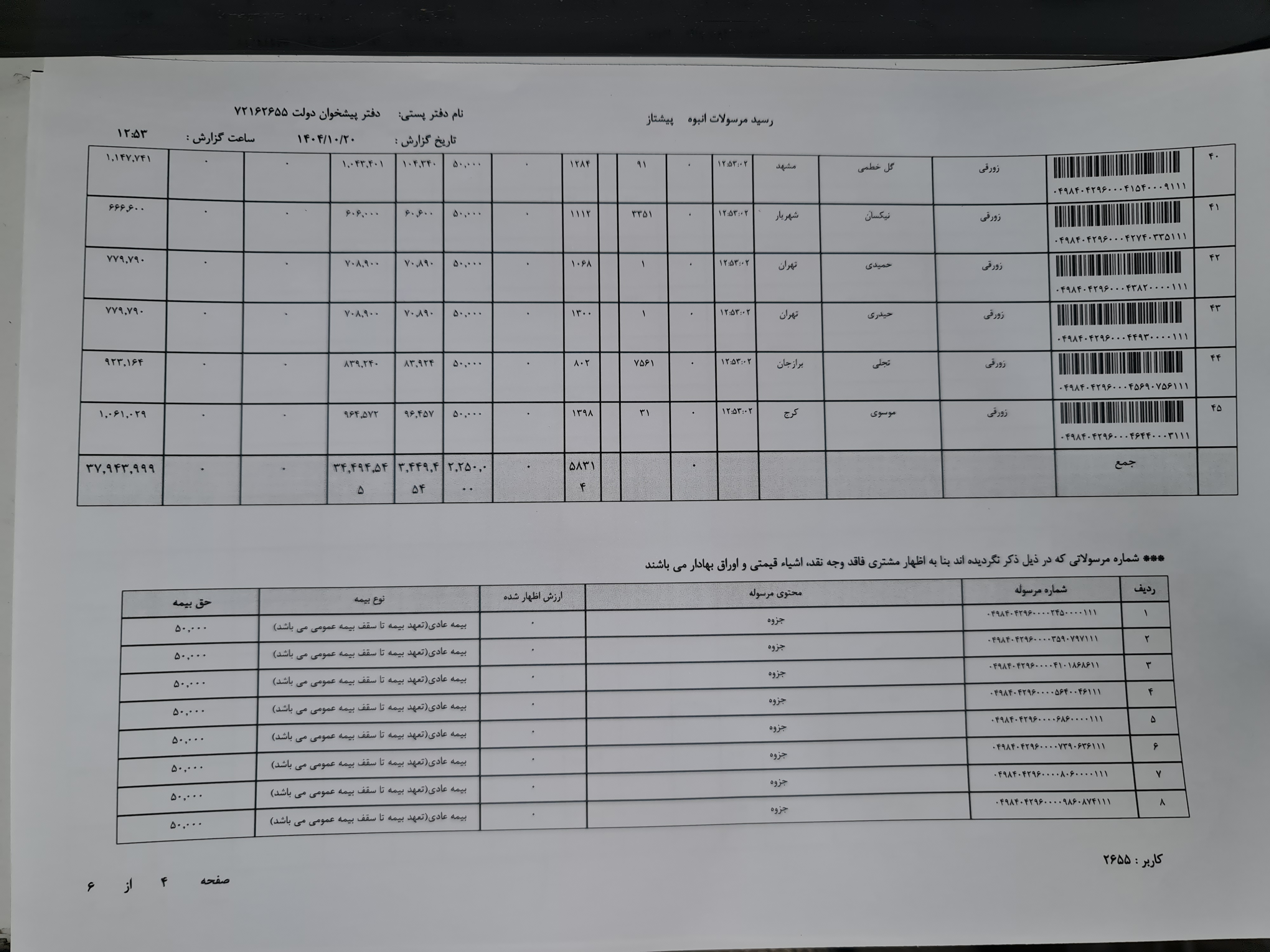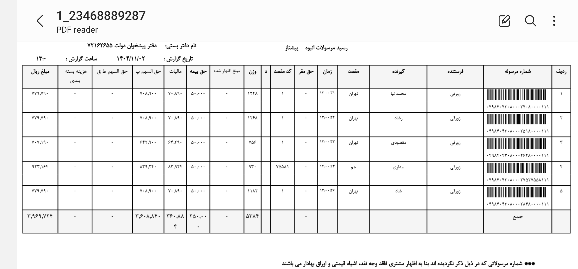 کد مرسوله های ارسالی دوشنبه ۲۲ دی