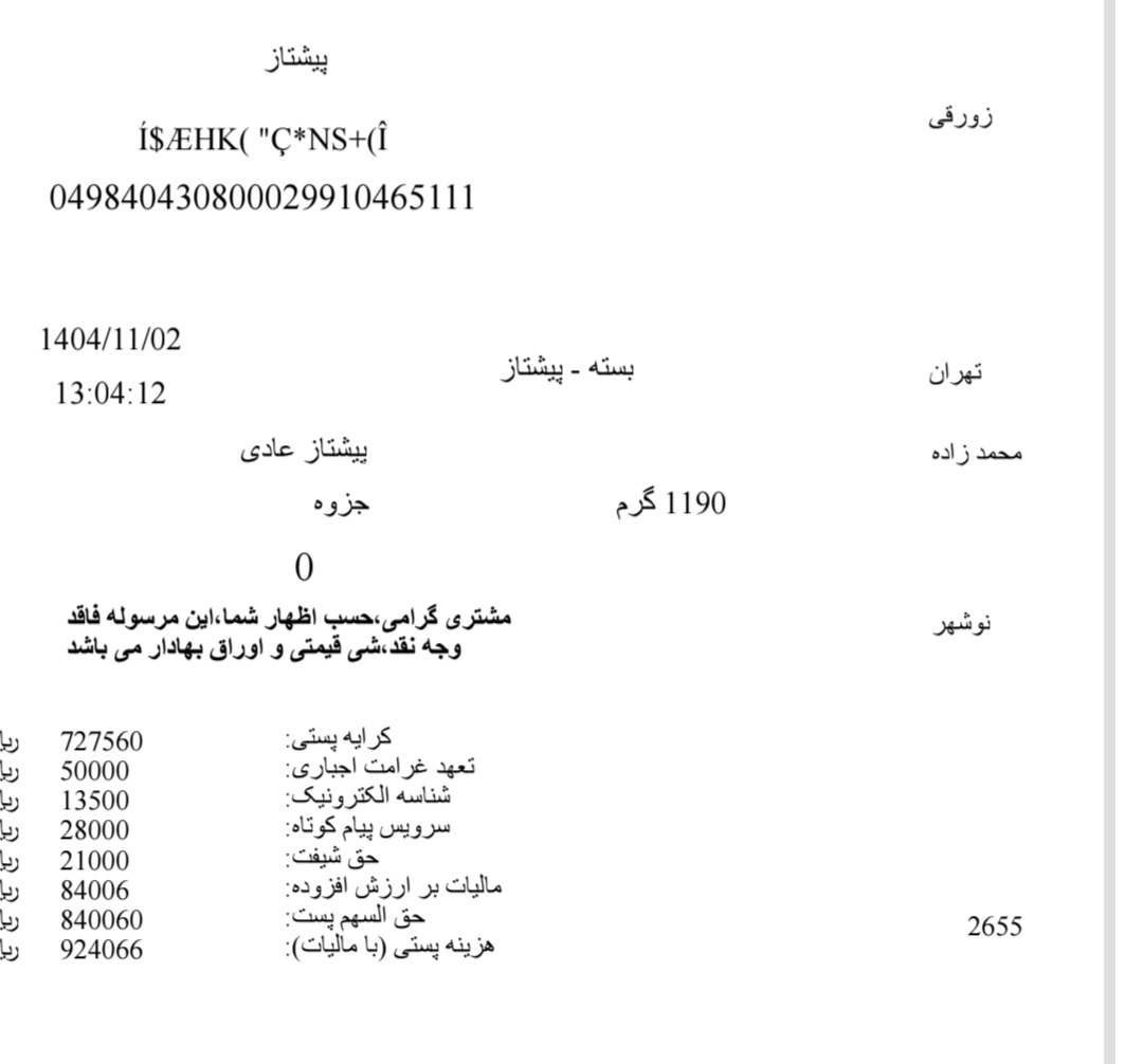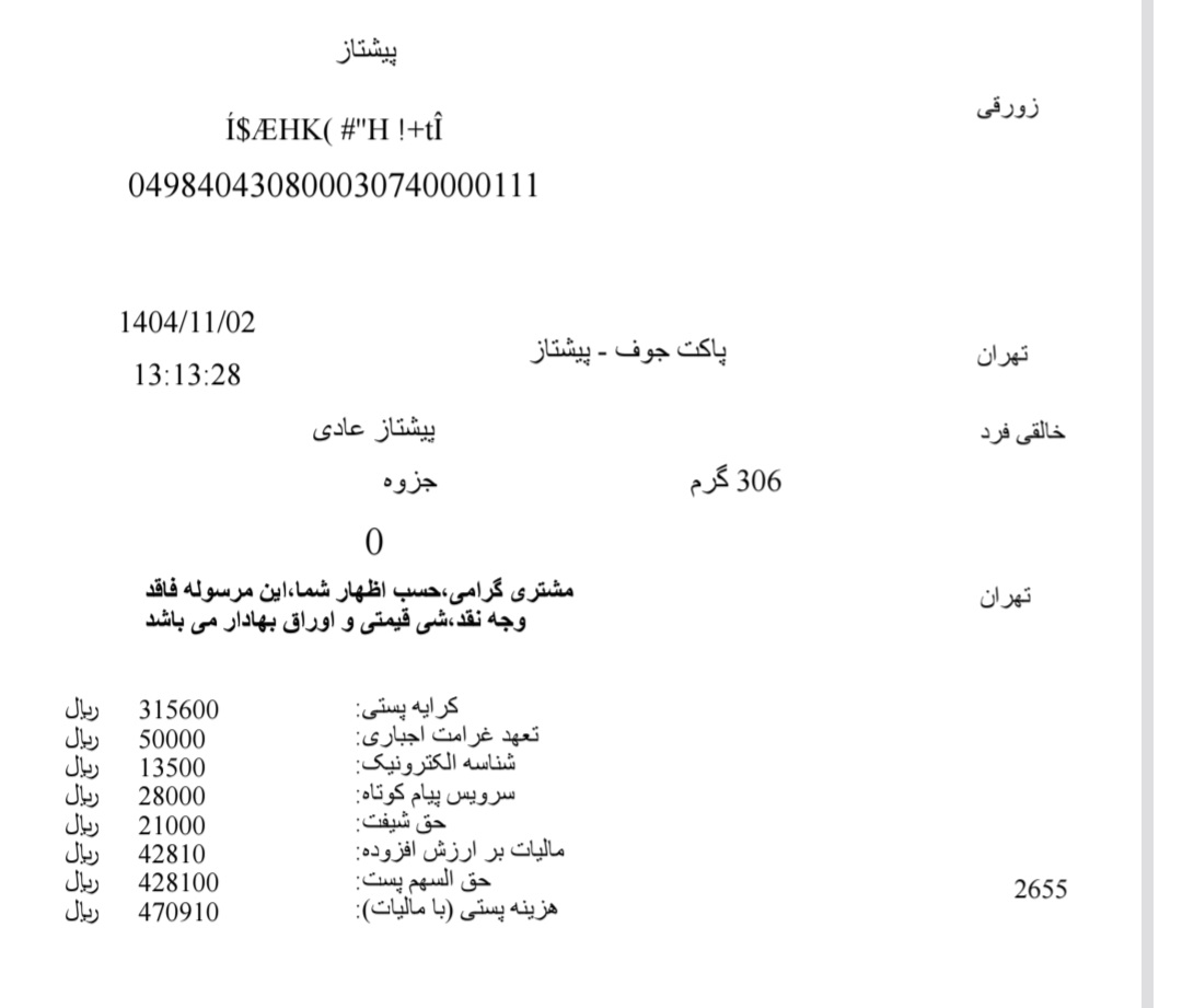 کد مرسوله ی ارسالی دوشنبه ۲۲ دی